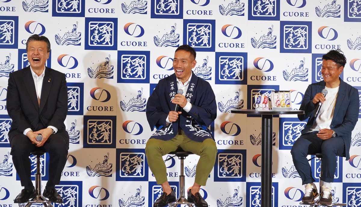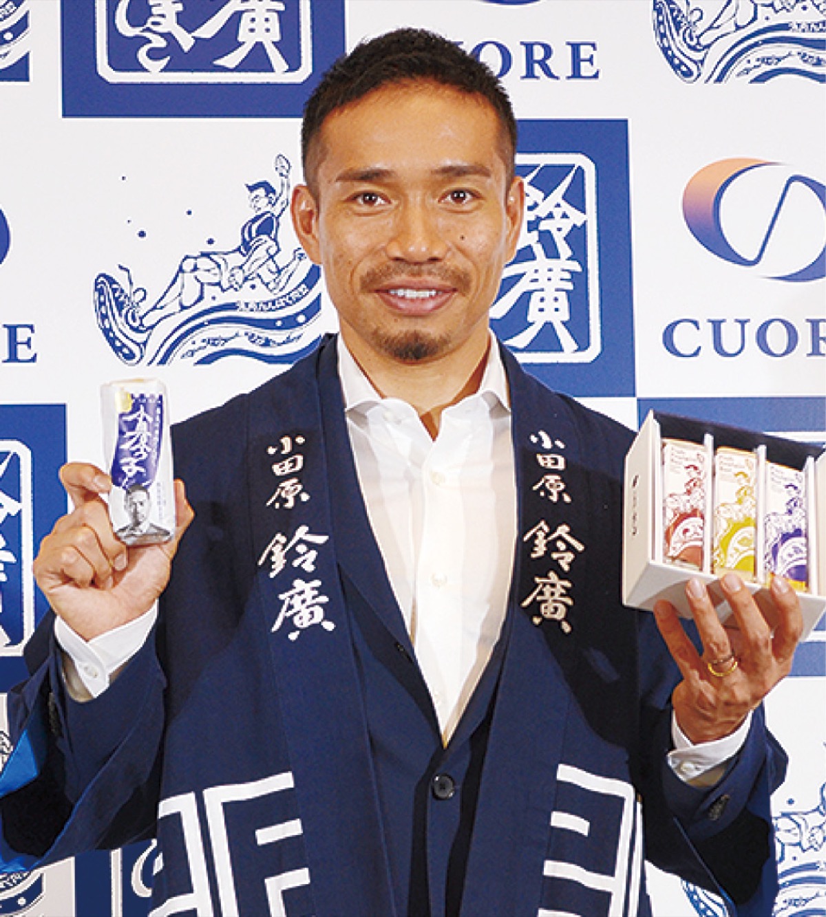 小田原市の株式会社鈴廣蒲鉾本店(鈴木博晶社長)と、サッカー日本代表の長友佑都選手が代表を務める株式会社Cuoreが昨年12月に結んだ「魚肉たんぱく同盟」。155年の伝統の技と世界の第一線で活躍するアスリートが共同で挑むプロジェクトについて6月28日、かまぼこ博物館で発表が行われた。