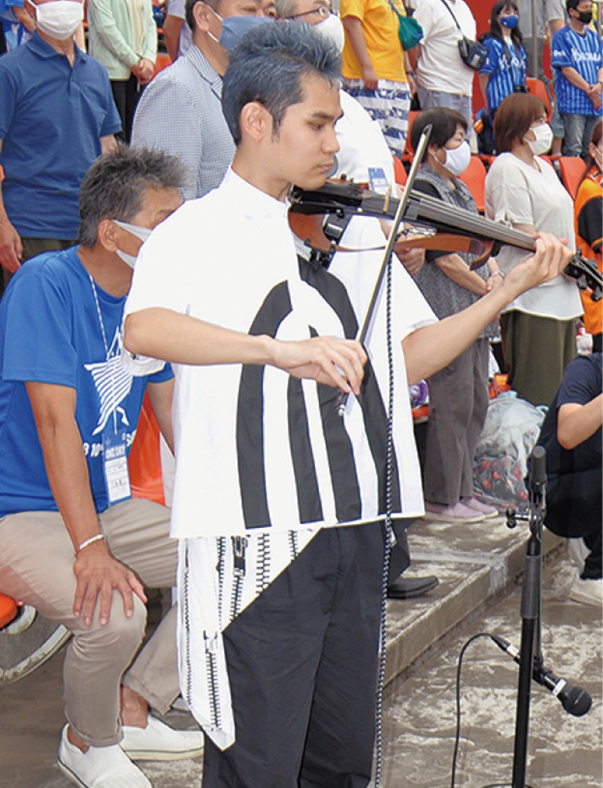 同球場では1年振りのプロ野球。開会セレモニーでは、小田原市在住のプロバイオリニスト式町水晶(みずき)さんが『君が代』を演奏し大きな拍手が送られた。