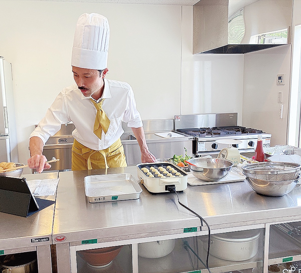 県立小田原高校出身の芸人、スベリー杉田さんが大井町の公式ユーチューブチャンネル「おおいひょうたんチャンネル」で、同町の農産物を使った料理づくりに挑戦している=写真。