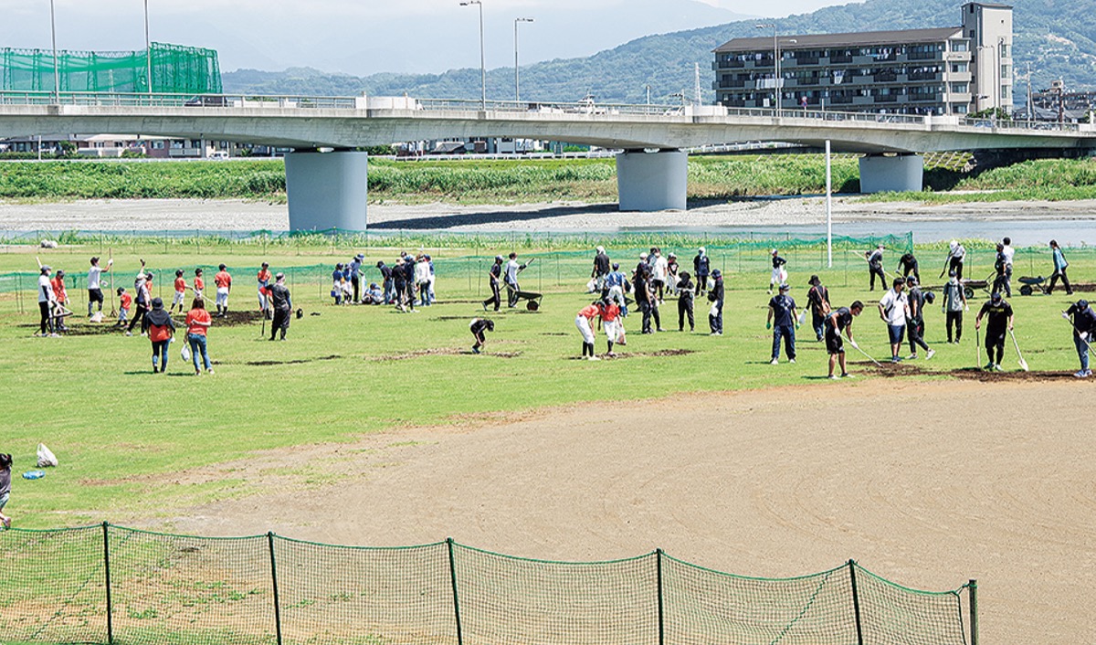 小田原ソフトボール協会と西湘ソフトボール連盟の関係者らが7月17日、大雨で被害を受けた酒匂川スポーツ広場の専用グラウンド4面の復旧整備を行った=写真。