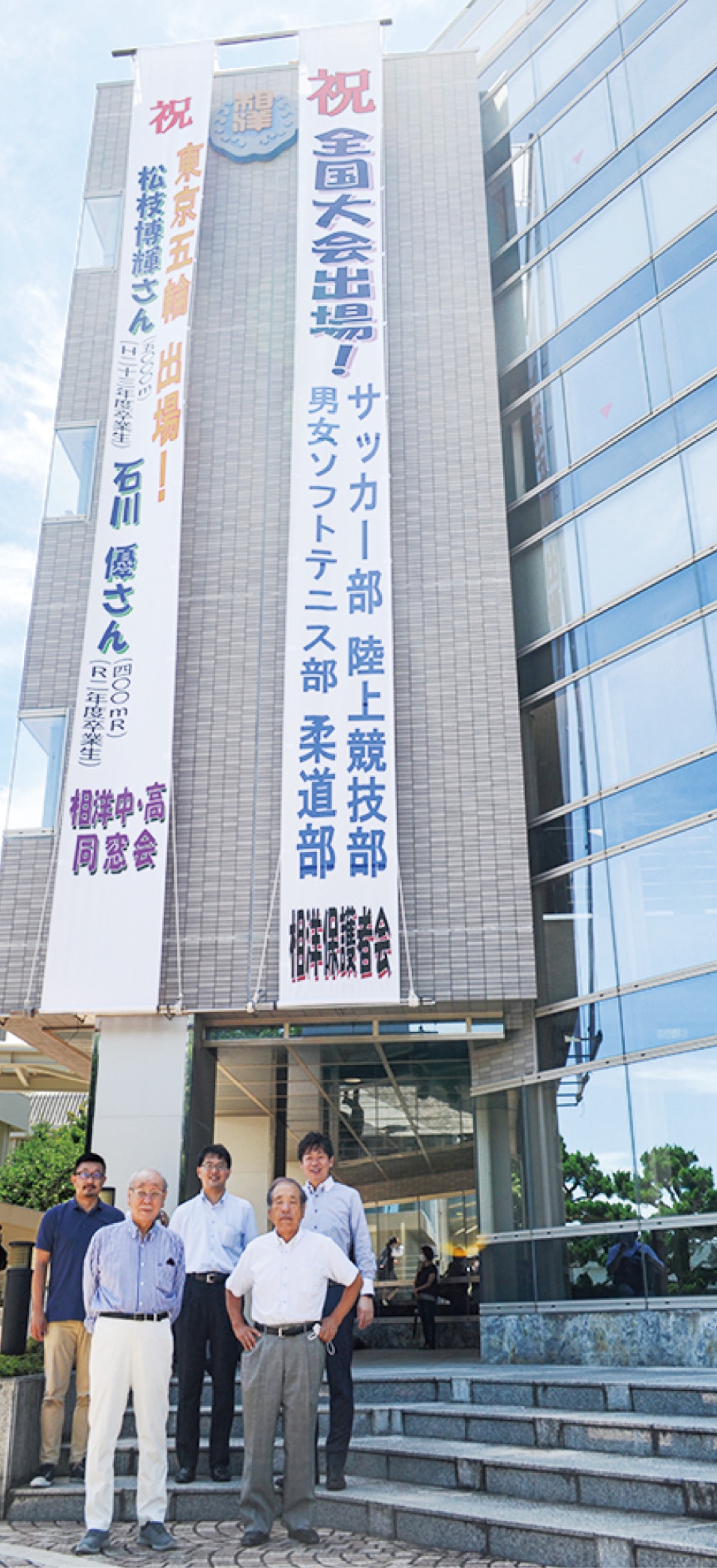 相洋中・高等学校同窓会(田中秀明会長)は、2人の偉業を称える横断幕を作り、高校の校舎壁面に掲げた。2人の出場が決まった時、先輩の偉業を在校生に伝えようと横断幕制作を企画したという。田中会長は「とても嬉しい。若い人たちの活躍は世の中に元気を与えてくれる」と目を細めた。「生徒の頑張りとともに、指導者の能力が高いと思う。欠点を補い、良い所を伸ばす、全ての面でレベルが上がっているからこそ素晴らしい成績を残せるのだと思う」と語った。