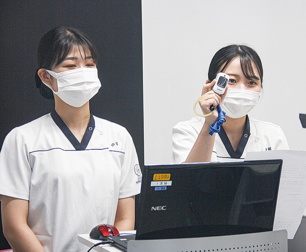同校職員がスライドショーで授業の様子などを紹介したほか、8月3日には3年生たちが体内の酸素飽和度を測定する装置の正しい使い方を解説する場面も見られた=写真=。同校は「これからも、医療従事者を目指す若者を育てていきたい」としている。オープンキャンパスは9月25日(土)にも開催予定。