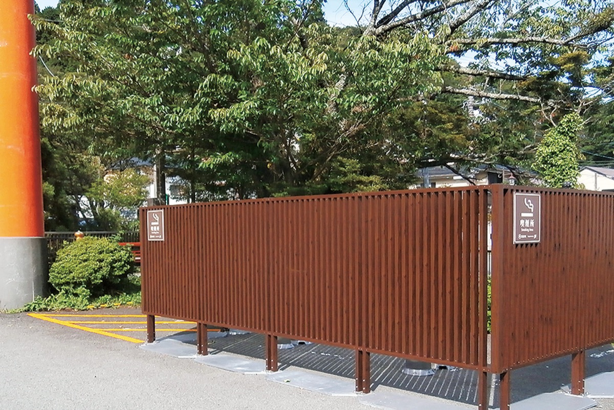 喫煙所は、強風対策と景観に配慮した木目調の格子状のパーティションで囲われ、10〜12人が入れる。灰皿はスタンド型で、時期によって4〜6個置かれる。