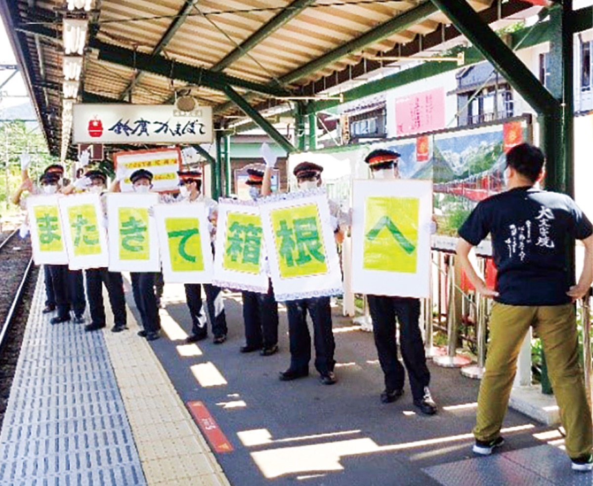 箱根登山鉄道(株)の乗務員や駅係員、強羅地域の住民が7月24日、強羅駅ホームで利用者に「お出迎え」、「お見送り」を行なった。これは、2019年10月の台風被害から復旧して1年を迎え、利用者に感謝の気持ちを伝えるために企画した。
