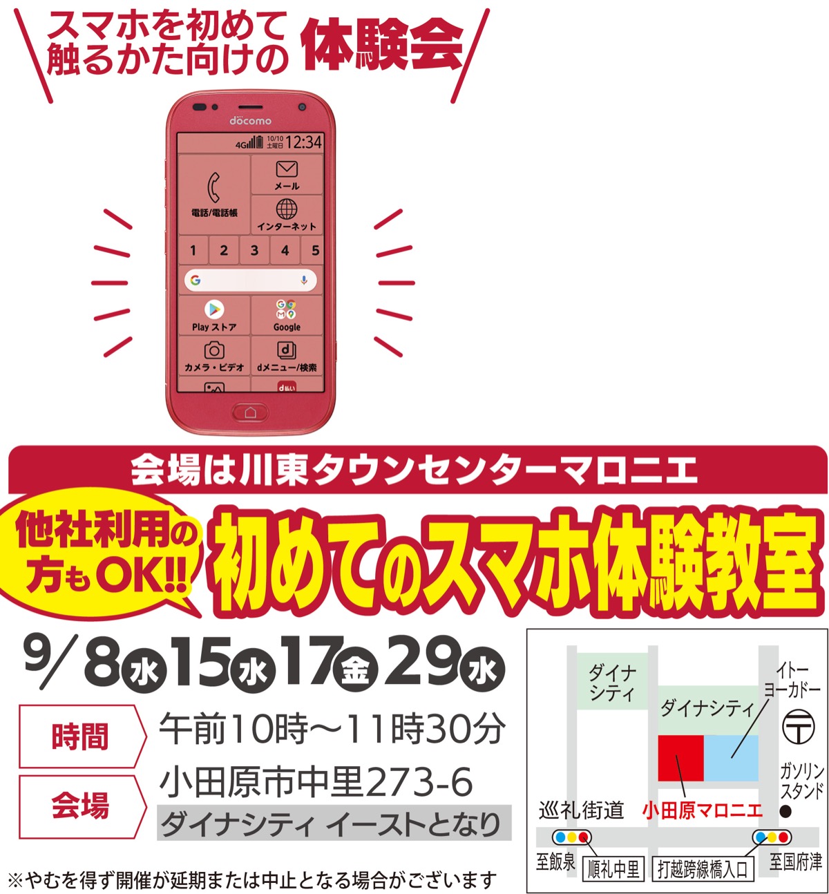 ガラケーを卒業し、家族や友人との交流もさらに活発になりそうなスマホの体験会は事前予約制(各回5人まで)。参加希望の人は「ドコモショップ小田原東店」へ電話、受け付けを。