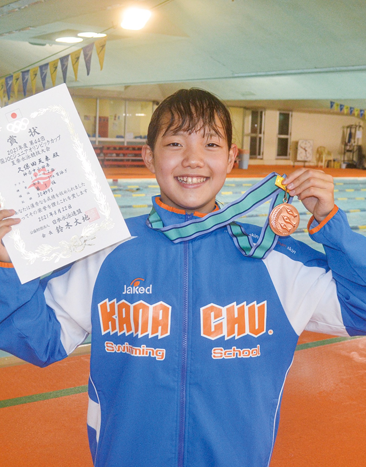 神奈中スイミング小田原所属の久保田天来(そら)さん(白鷗中1年)は、女子背泳ぎ50m(11〜12歳)で3位に輝いた。