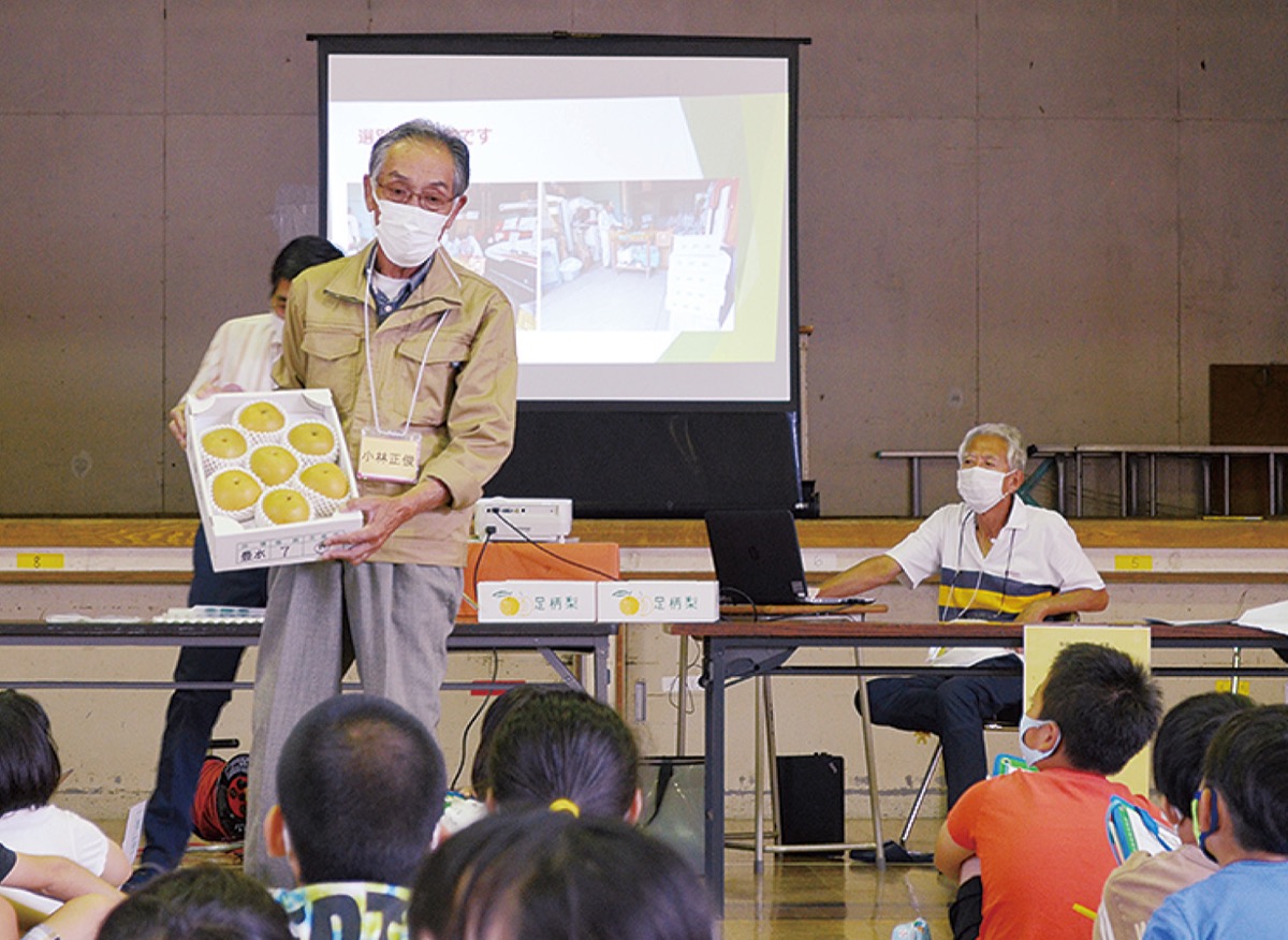 上府中地区まちづくり委員会の農業プロジェクトチームが9月8日、市立千代小学校の3年生にナシ栽培についての特別授業を行った。例年は地元のナシ園で収穫もしていたが、今年度は新型コロナの感染拡大を受け、体育館での講習のみ。収穫できない代わりに、ナシをプレゼントした。
