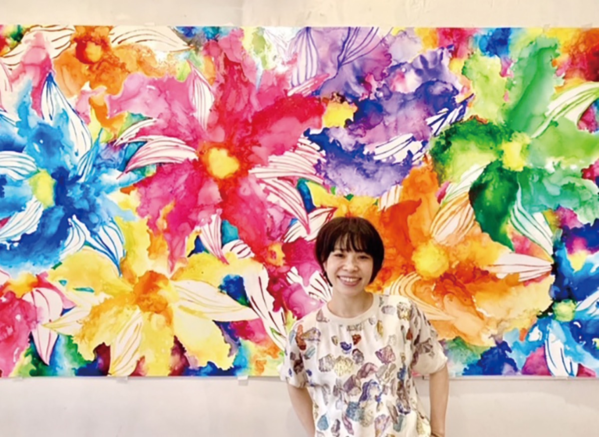 アルコールインクとは、アルコールをベースとした油性カラーインク。松川さんは、ファッション企業で働きながら昨年転機を迎え、独学で絵画制作を始めたという。葛藤や学び、人への感謝などを描き、国際的に活動している。