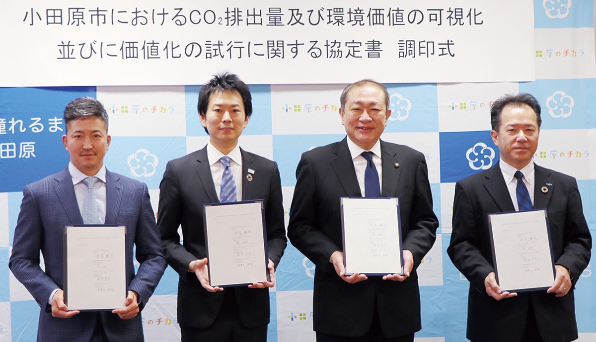 小田原市と連携して取り組みを行うのは、湘南電力(株)と(株)エナリス、(株)ゼロボード。太陽光発電で創出された再生可能エネルギー(再エネ)の消費をCO2削減効果と見立て、消費量に応じてクーポンを発行し、市内の協力店でさまざまなサービスと交換できる独自の仕組みを構築する。
