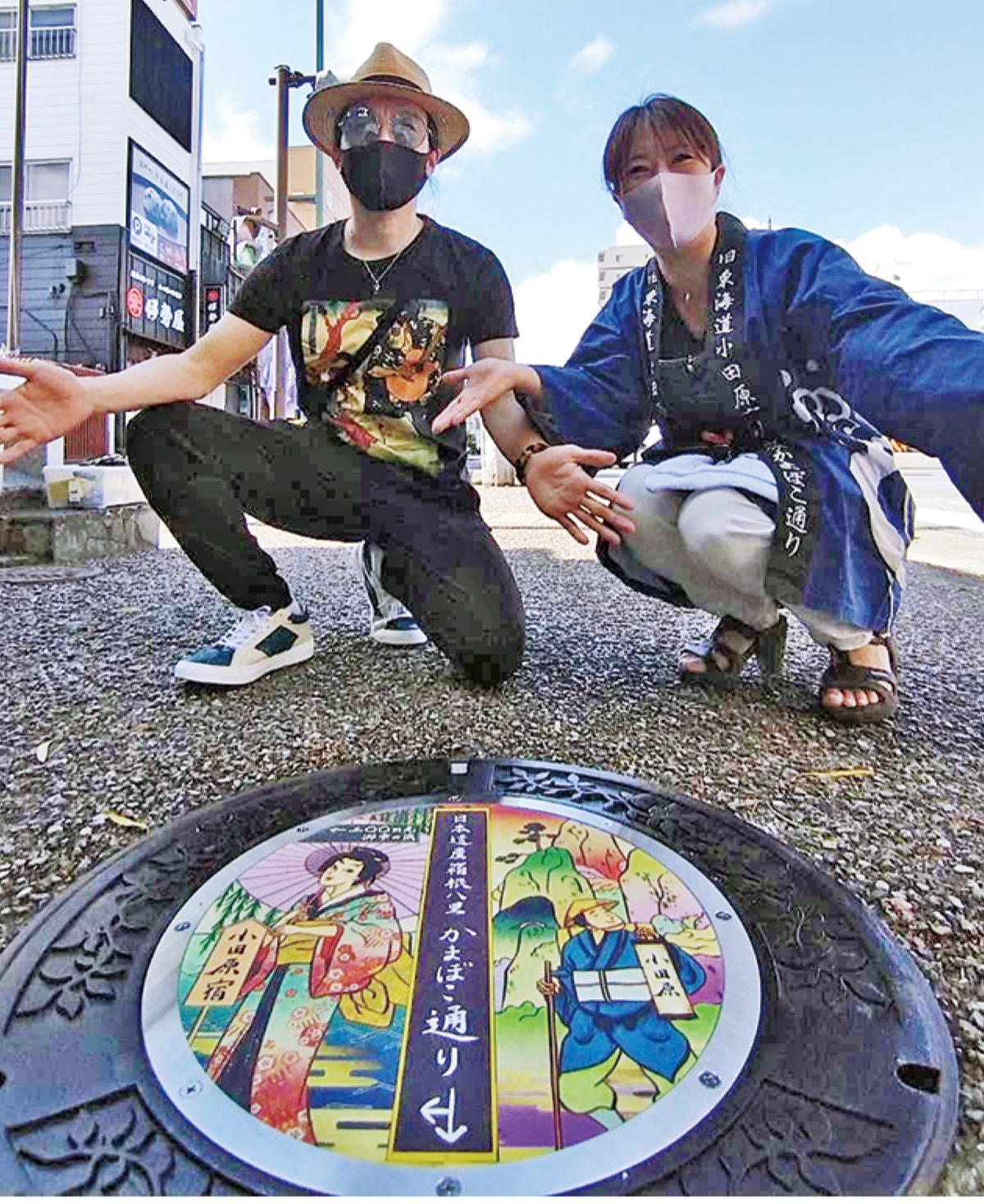 小田原市本町の小田原かまぼこ通りに9月28日、新たに2つのデザインマンホール蓋が設置された。小田原宿なりわい交流館前には日本遺産「箱根八里」の風景が、間中病院付近には昭和初期に盛んだったブリ漁と現代の食べ歩きの様子が描かれている。