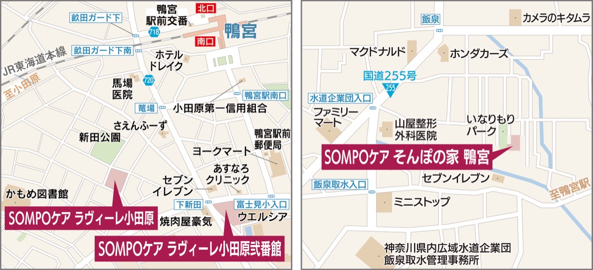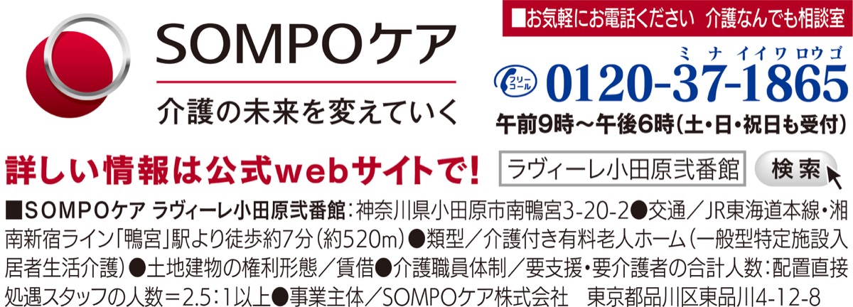 他にも小田原市内には、南鴨宮の閑静な住宅街に位置する「SOMPOケア ラヴィーレ小田原」と、良心的な料金形態の「SOMPOケア そんぽの家 鴨宮」もある。こちらも気軽に相談を。