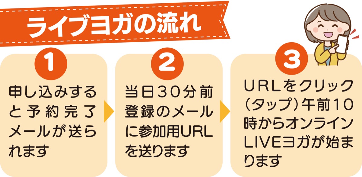 参加希望者は専用のアドレスにアクセスし予約フォームから申し込む。当日30分前にLIVEヨガのURLが届き参加する。https://kaisei-ssc.net/online-live-yoga/ 担当者は「初めての人、そうでない人もお気軽に参加ください」と呼び掛けている。