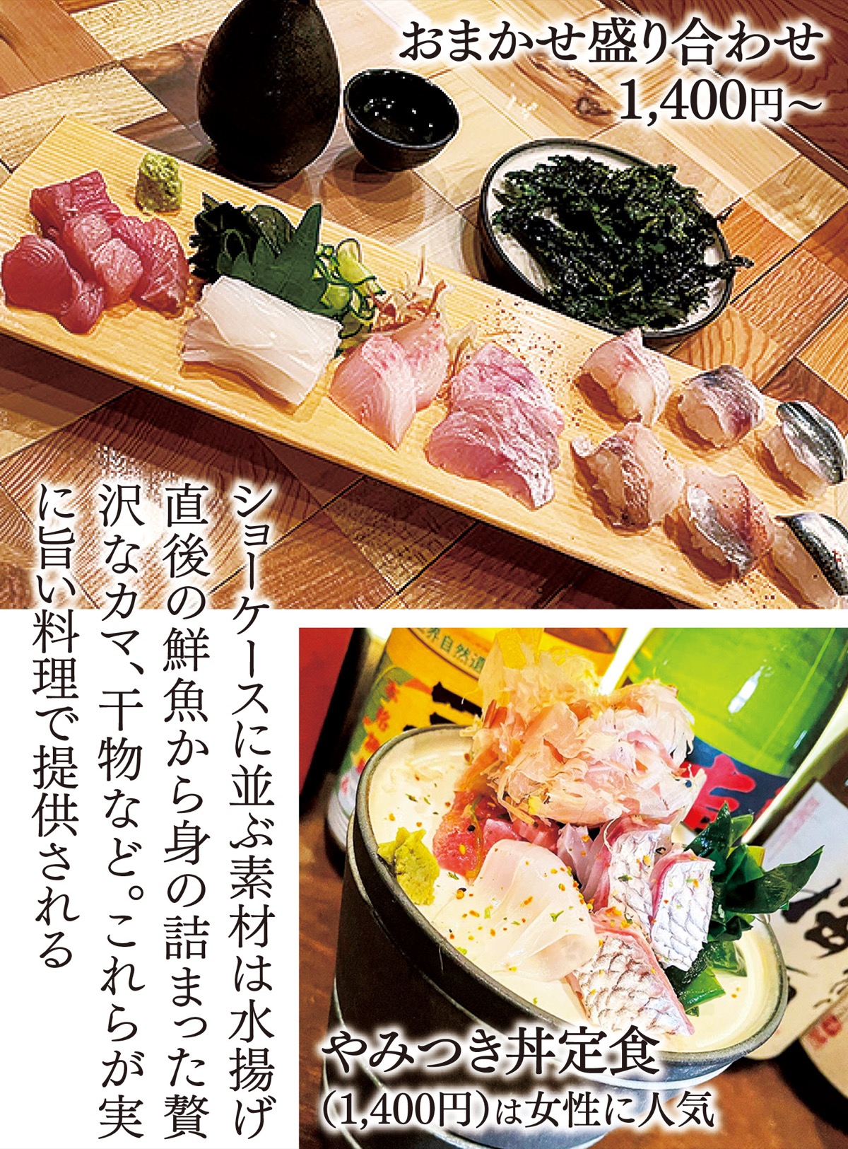 カウンター前に並ぶ水揚げ直後の鮮魚、カマなどを繊細かつ豪快に調理するスタイル。昼は別皿の刺身とご飯、汁物に小鉢がセットの「やみつき丼定食」やフライ定食を堪能。夜はお造りから一品に加え、お勧め素材をその日の最適な食べ方で頂く「おまかせコース」(4千円〜)まで、どれも美酒とともに楽しめる。