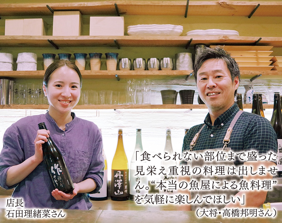 地元で130年続く鮮魚店の4代目、高橋邦明さんが地ものから全国の旬素材を選り抜いて提供する同店。一流ホテルからも一目置かれる高橋さんの素材を見抜く、匠の眼を反映した店には県外から足繁く通う人も多い。