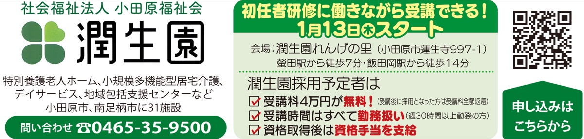 超高齢化社会を迎え、ますます重要な役割を担う介護職。小田原市と南足柄市に31拠点を構え、地域密着で高齢者介護福祉サービスを展開している潤生園では、社員研修に力を入れている。初任者研修を取得した細川麻好(ますみ)さんと二見奈津樹さんに話を聞いた。
