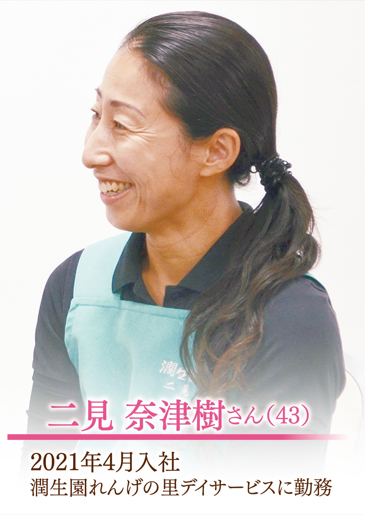 二見さん「職場の皆さんがとにかく優しいです。サポート体制も整っているので、安心して仕事ができます。お年寄りの方々からはいつも元気をもらったり、励まされたり、人生の重さを教えていただいたり。子育てと両立して働くことができるので、これからも経験を積みながらキャリア形成していきたいです」