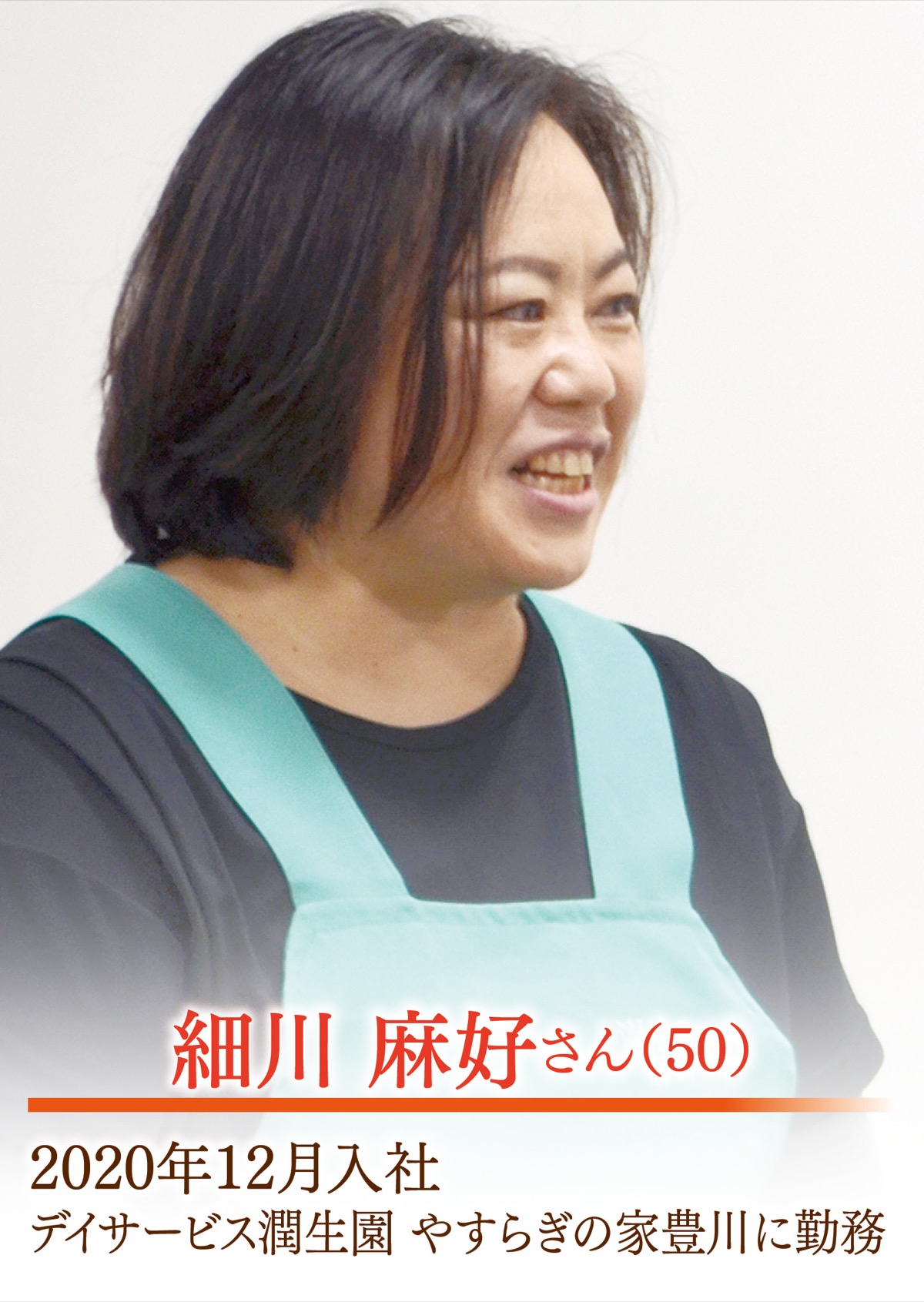 細川さん「皆さんプロ意識を持って仕事をしているので、すごく刺激になります。研修制度が充実しているので、働きながら資格を取得できるのも潤生園の特徴だと思います。私は先日、実務者研修の資格を取得することができました。将来的にはケアマネジャーを目指して地域の役に立ちたいです」