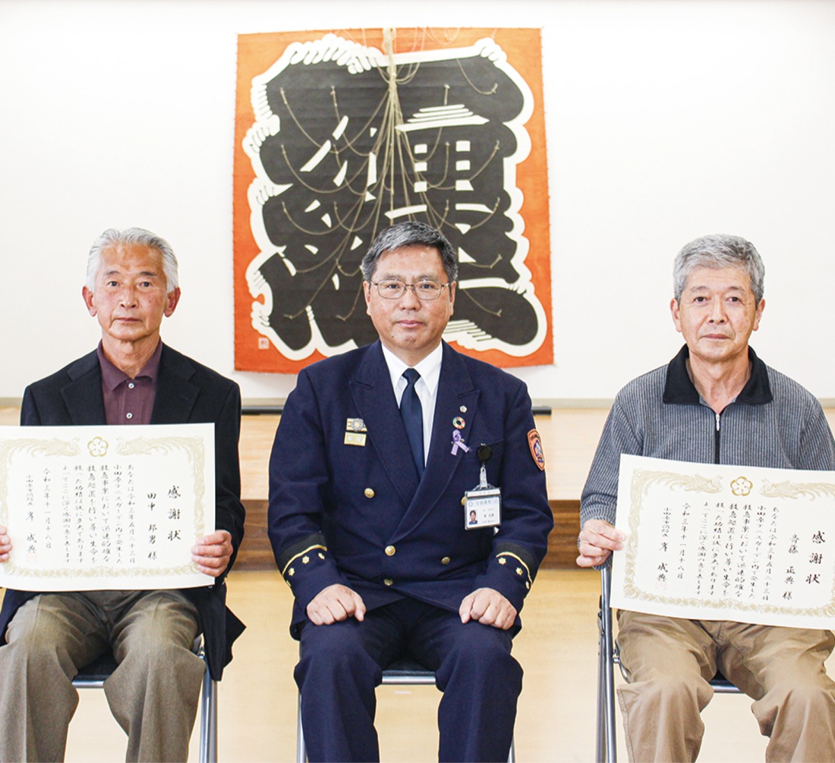 小田原市消防本部(岸成典消防長)が11月18日、小田原市内で人命救助をした田中邦男さん(開成町)と斎藤正典さん(松田町)、吉川剛志さん(横浜市)に感謝状を贈呈した。