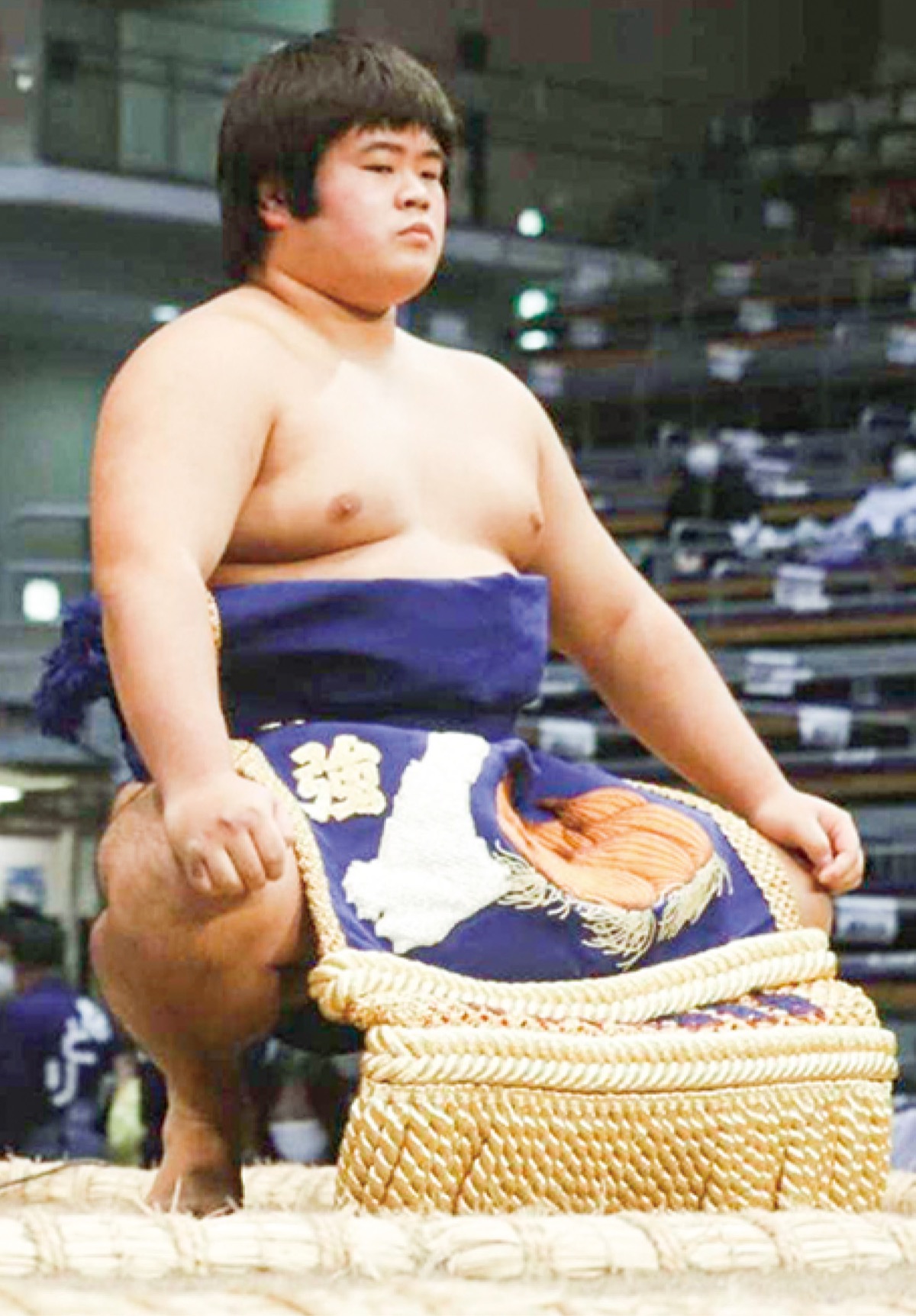 新名学園旭丘高校相撲部で今年度の主将を務めた原尾文隆さんが11月に行われた大相撲九州場所の8日目で、伊勢ケ濱部屋所属の「蒼富士(あおいふじ)」として新序出世披露に臨んだ。