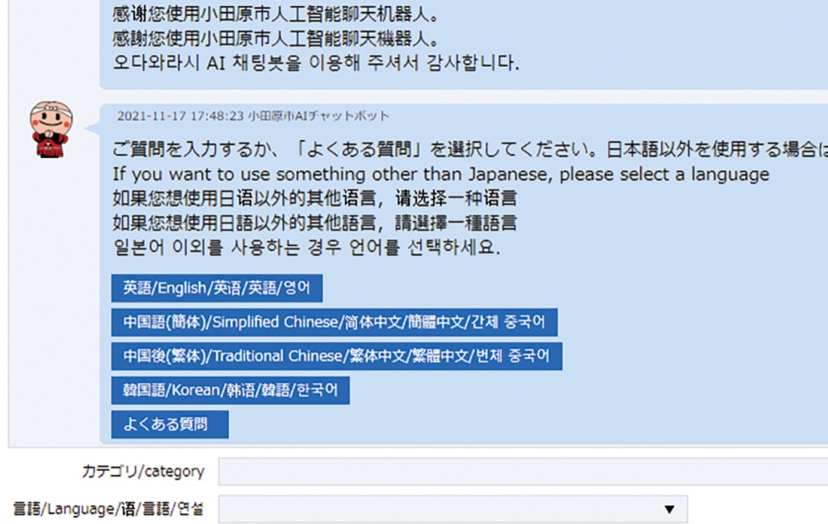 住民や観光客らの利便性向上、職員の負担軽減などが見込めるAIチャットボットは県内外の自治体で導入が進んでいる。小田原市では、ウィズコロナ、アフターコロナの時代に合った新しい生活様式の整備を進める「デジタル化によるまちづくり推進事業」(事業費6千30万8千円)の一環として、横浜市や川崎市、広島県広島市や沖縄県竹富町などの先例を参考にAIチャットボットを導入した。