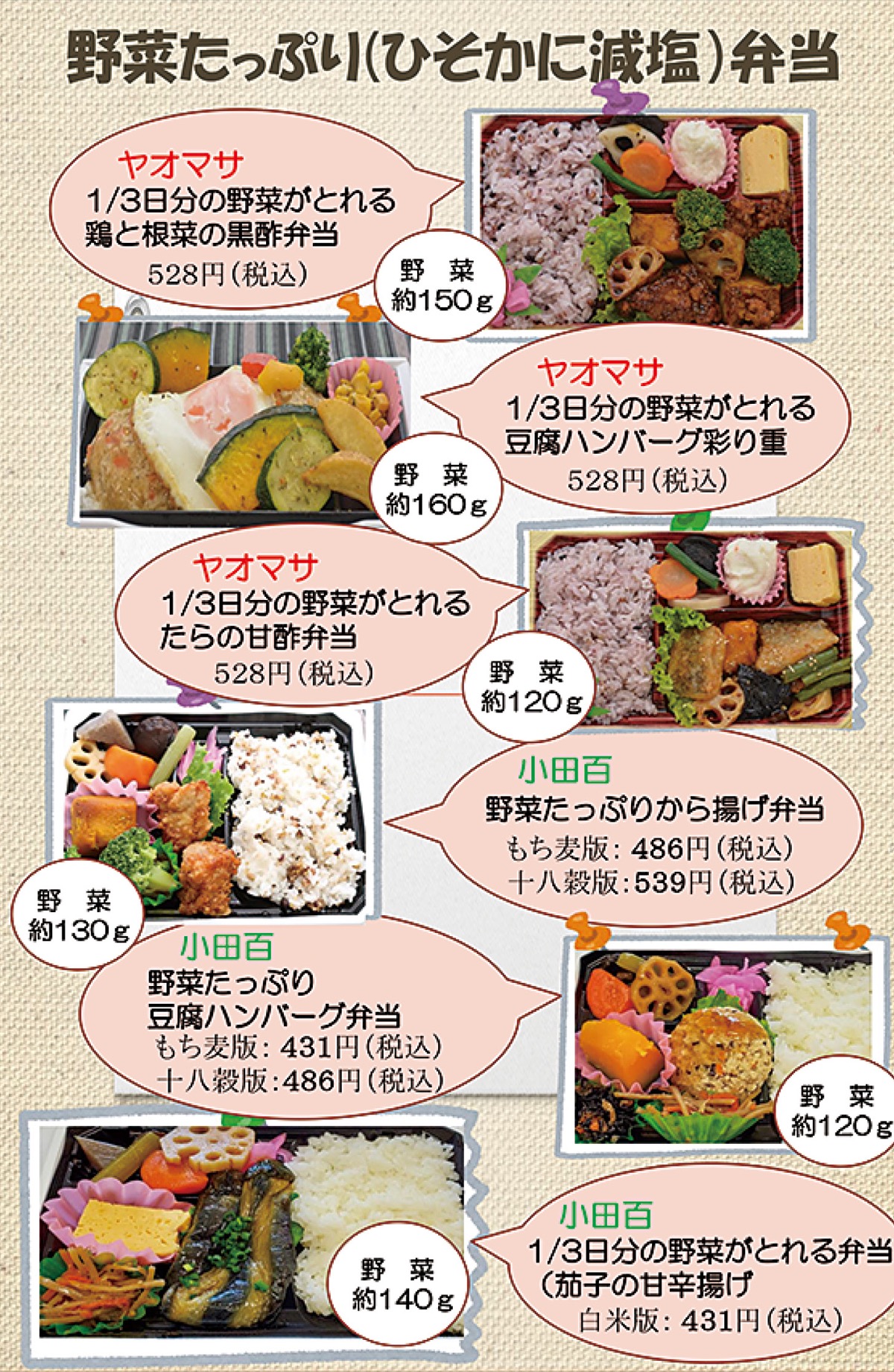 小田原市では脳血管疾患による死亡率が高く、2018年における調査では県内19市中ワースト1位だった。依然として死亡率の高い状況が続いていることから、市は発症予防のため塩分を減らし、1日の野菜摂取目標量の約3分の1を一食で取れる弁当6種類を、ヤオマサ、小田原百貨店と協力して作った。市の健康増進計画では、1日350g以上を野菜の摂取目標としている。