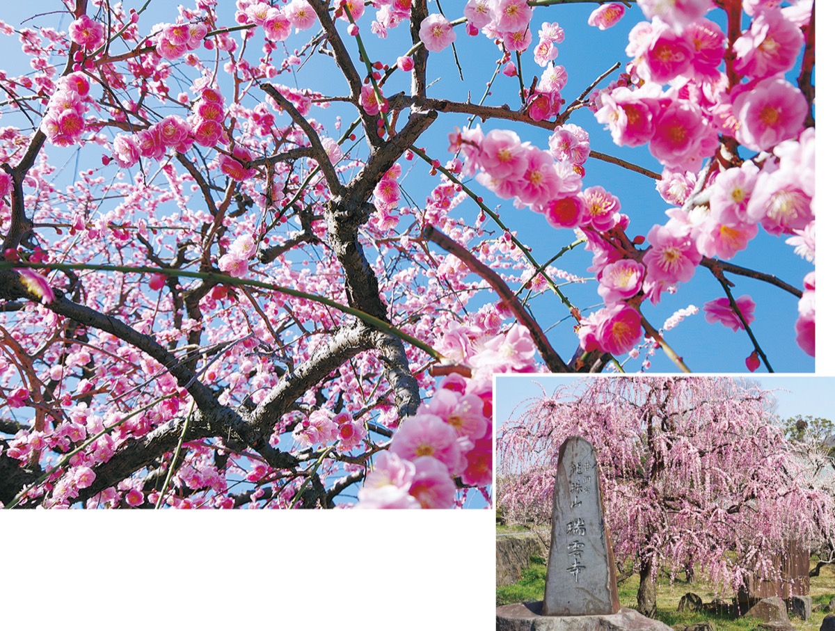 曽我丘陵の麓、明応元(1492)年に創建され、現在は花の寺としても愛される瑞雲寺。50年ほど前から地域の総代らが来訪者の目を楽しませようと植えている梅の一つが寺の入り口近くに佇むしだれの銘木だ。