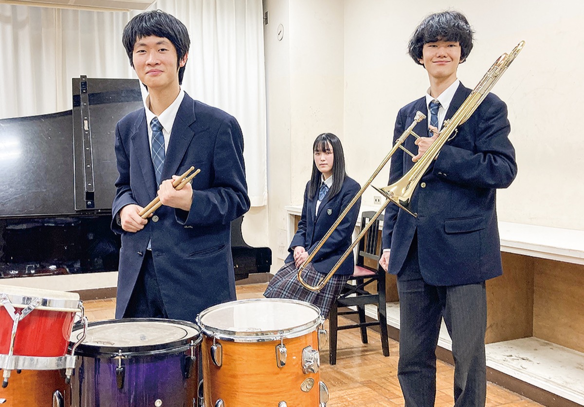 新名学園旭丘高校2年生で吹奏楽部の大関悠斗さんと小石貴生さんが2月11日(祝)、上野学園大学(東京都台東区)で行われる「全日本中学生・高校生管打楽器ソロコンテスト」関東甲信越支部大会予選に出場する。大関さんはマルチパーカッション、小石さんは松岡凛さん(2年)の伴奏とともにトロンボーンでステージに上がる。
