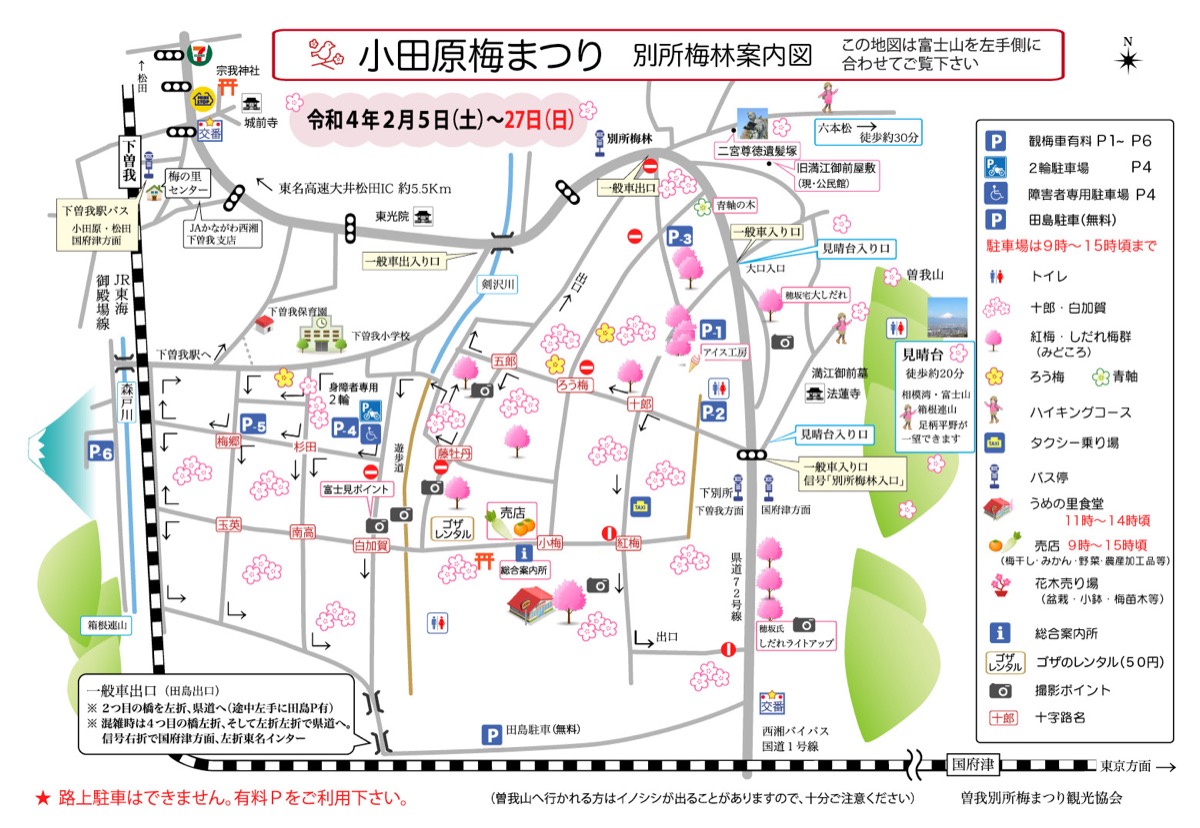 開花状況はや有料駐車場の場所は、曽我別所梅まつり観光協会のHPで公開している。