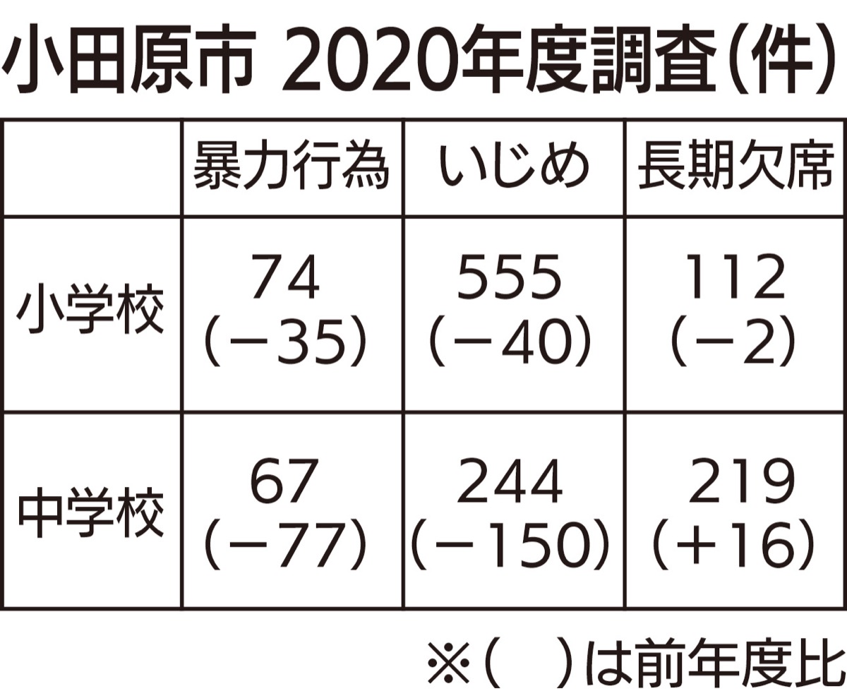 小田原市は2020年度の市立小・中学校の暴力行為・いじめ・長期欠席の調査結果をこのほどまとめた。対象は市立小学校25校・中学校11校、調査期間は20年4月1日から21年3月31日まで。