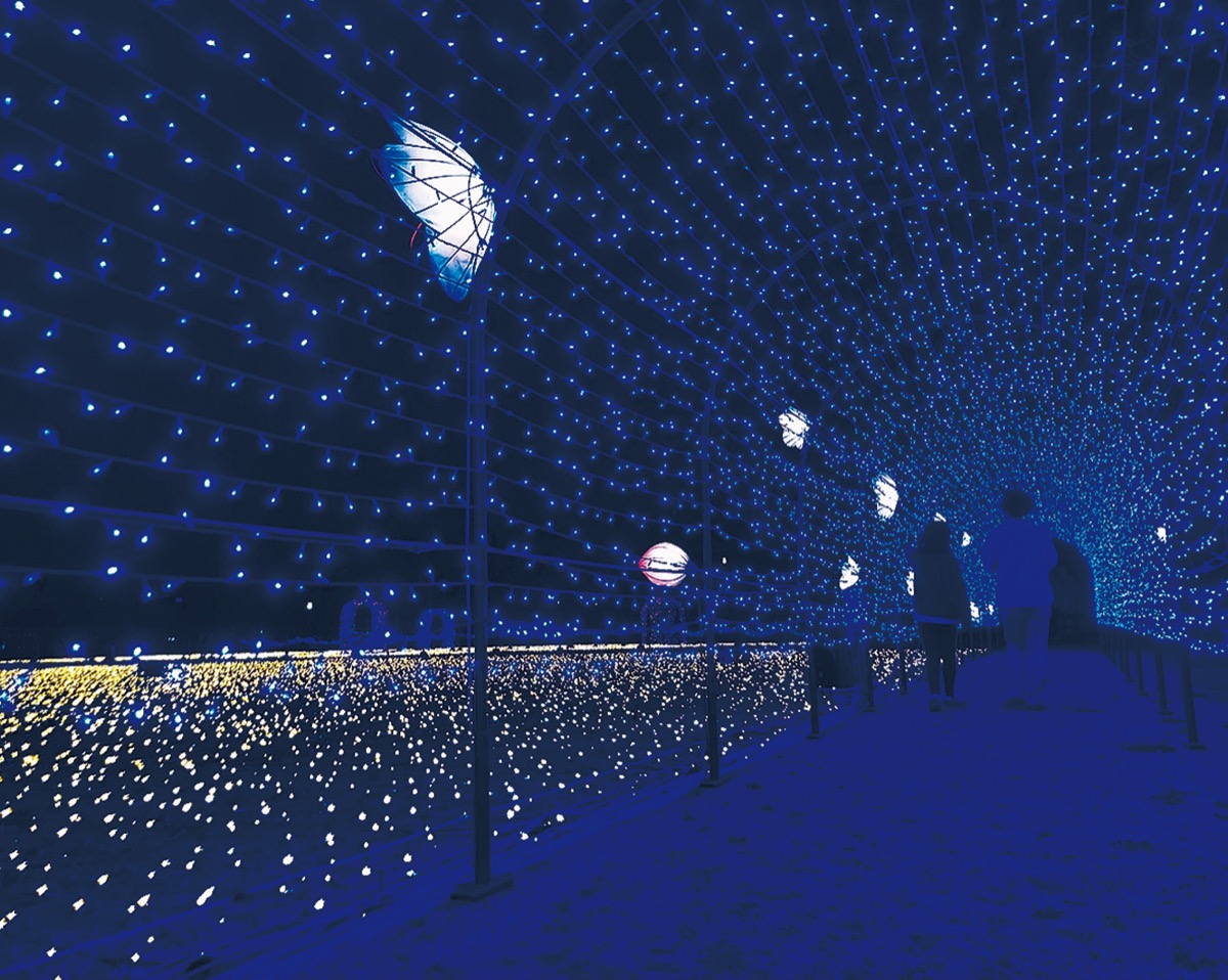 城址公園銅門広場では4月10日(日)まで「小田原城 春のイルミネーション」を開催している(午後6時〜9時・入場無料)。今回は約4万球のLED電球がトンネルや広場一面を幻想的な光でデコレーション。音響に合わせたイルミネーションショーとレーザーショーが行われている。