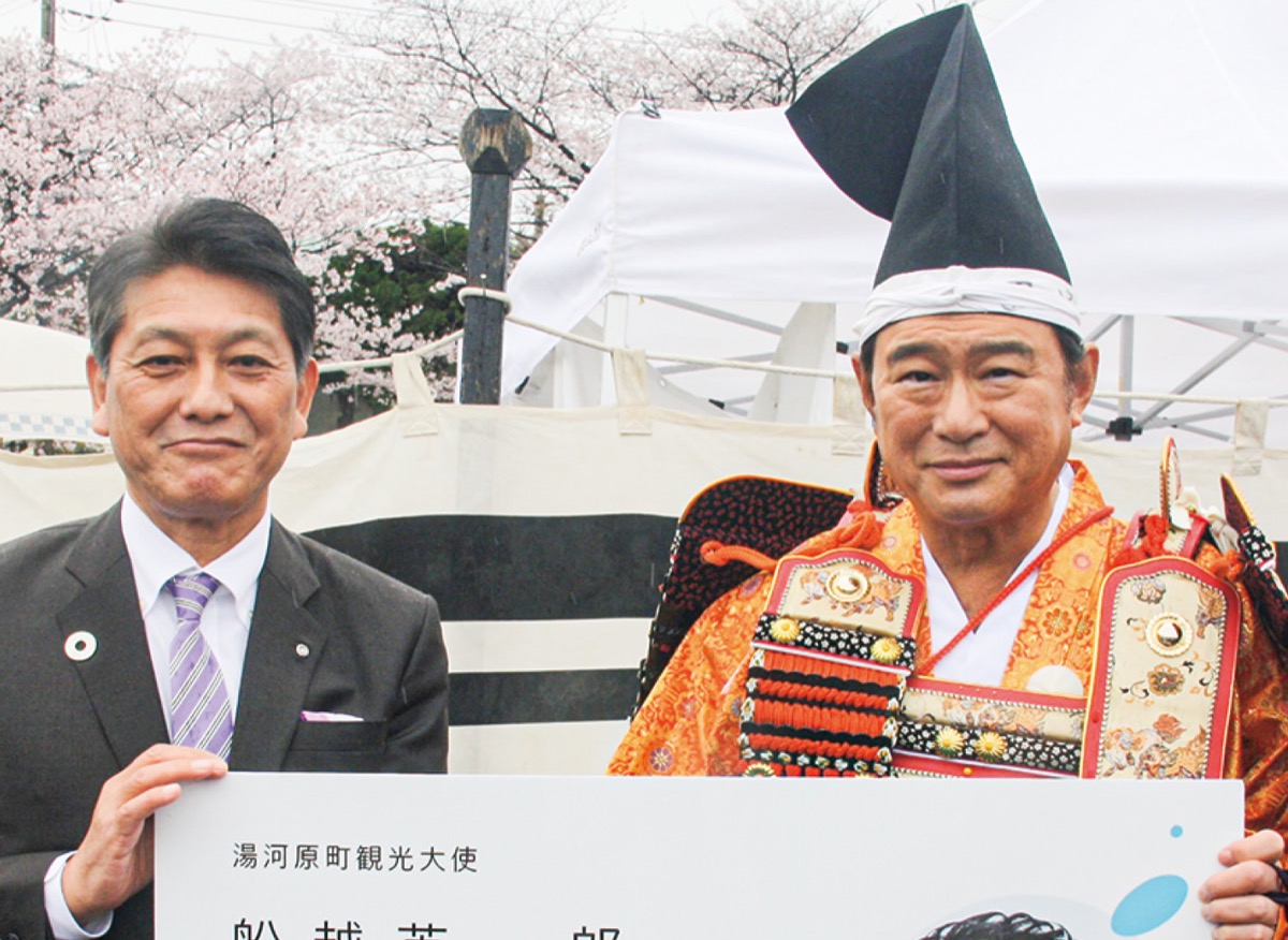 湯河原町出身の俳優・船越英一郎さんが4月3日、同町観光大使に就任した。町内の桜木公園で任命式が行われ、源頼朝に扮した船越さんが来場。多くのファンらが見守る中、冨田幸宏町長が「湯河原の魅力を多くの人に伝えるため、お力添えください」と期待を込めて伝えた。