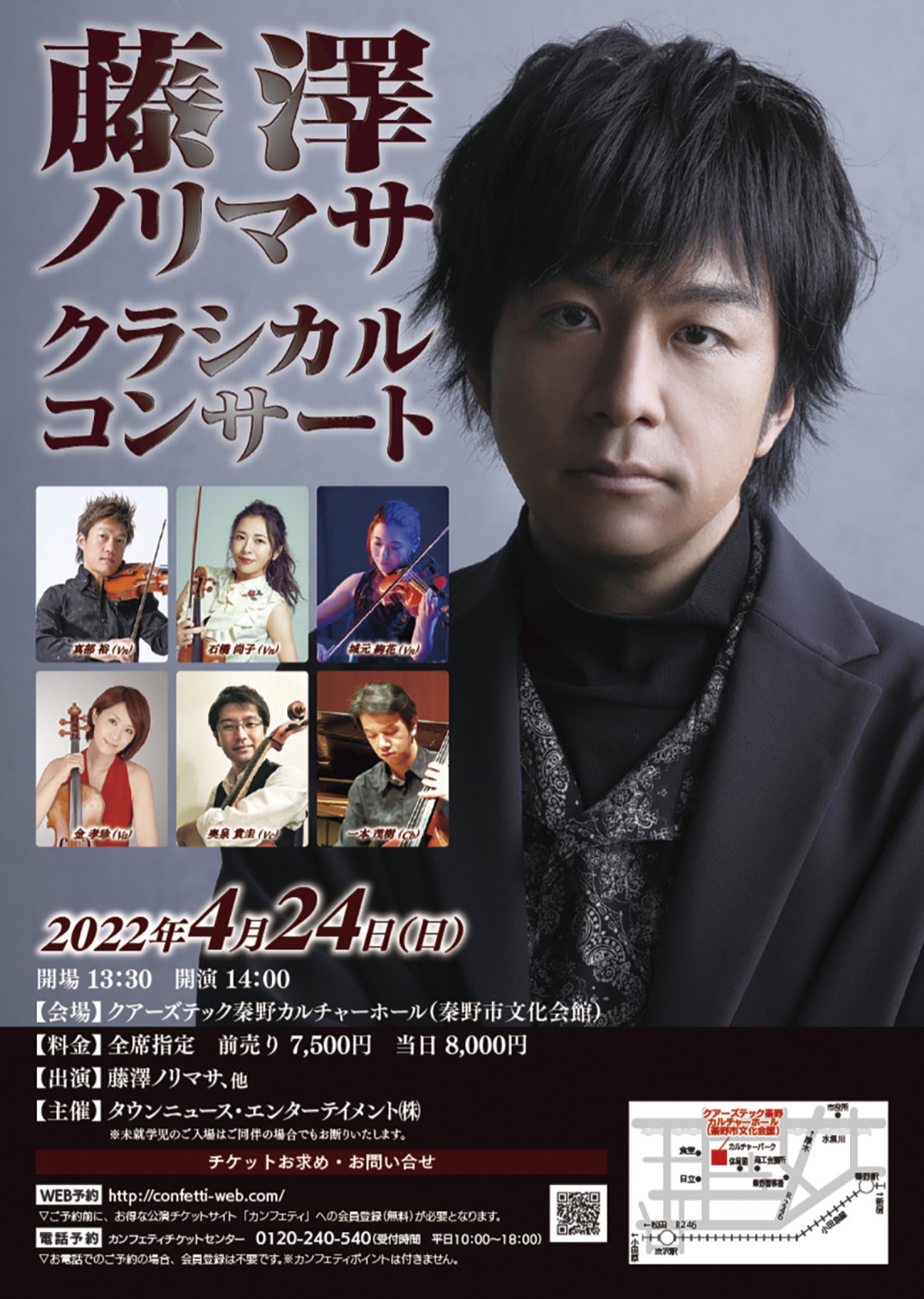「心のどこかにかならず光はある」――。昨年5月に3年ぶりのオリジナルアルバム「La Luce―ラ・ルーチェ―」を発表し、その歌声で多くの人々に癒しを届けた藤澤さん。今回のコンサートはこのアルバムの楽曲を弦楽アンサンブルとともにクラシカルアレンジで「藤澤ノリマサクラシカルコンサート」として開催。