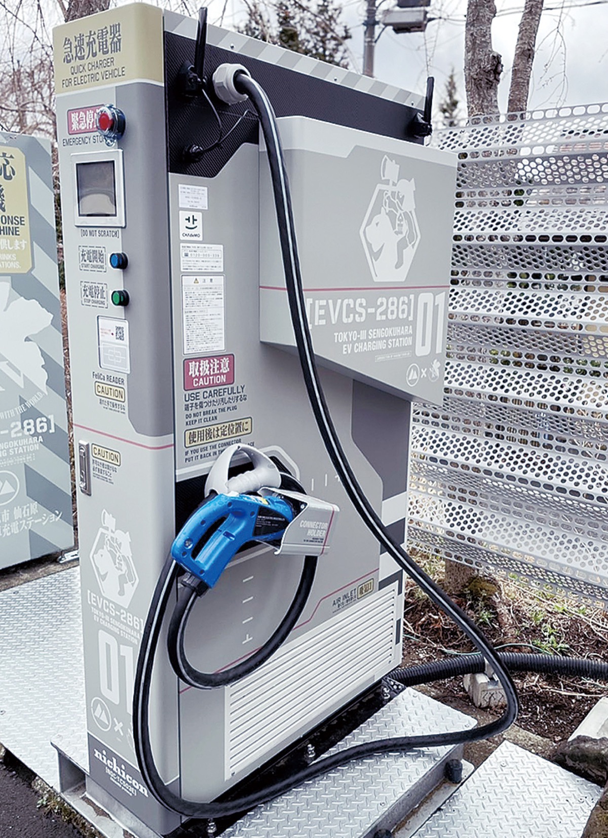 地域の活性化と、脱炭素型社会の構築を目指す取り組みの一環として、箱根町はこのほど、町内仙石原に、人気アニメ『エヴァンゲリオン』のラッピングを施した電気自動車用急速充電器を新設した。