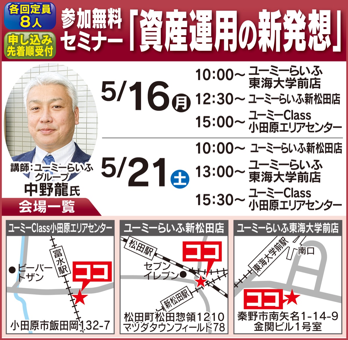 この資産運用に関する無料セミナーが5月16日(月)、21日(土)に開かれる(会場、時間は上記表参照)。各回30分+質疑応答、定員8人(申込先着順)。講師は、湘南エリアで不動産事業を展開するユーミーらいふグループの中野龍氏。当日は同社が手掛ける不動産小口商品「まちシェア」を実際に購入している中野氏の体験談を題材に、金融資産の相続対策や分配金などについて分かりやすく説明する。終了後、個別相談も実施。