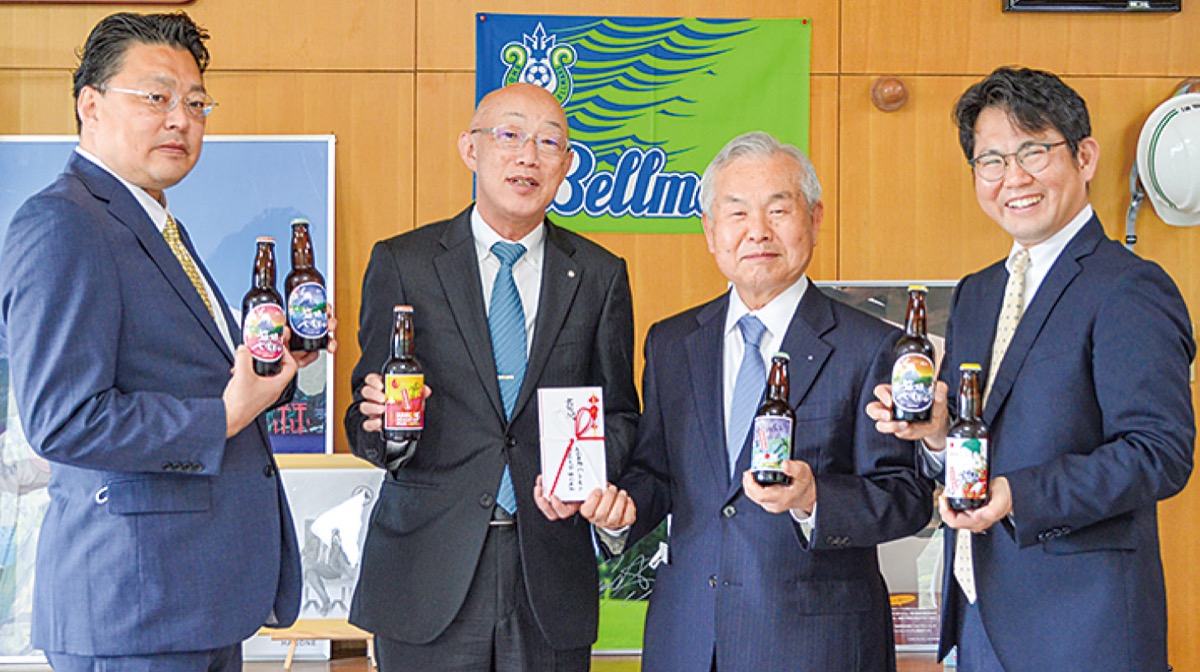 箱根七湯ビールを製造する酪農王国(株)(静岡県函南町/西村悟社長)と、流通販売する(株)ハシモト(小田原市/橋本太市社長)が4月19日、箱根町に30万円を寄付した。環境保全のために2012年から続けており9回目。毎年10万円を寄付していたが、今回は新型コロナの影響で延期されていた20年、21年の分も合わせた3年分を勝俣浩行町長に手渡した。