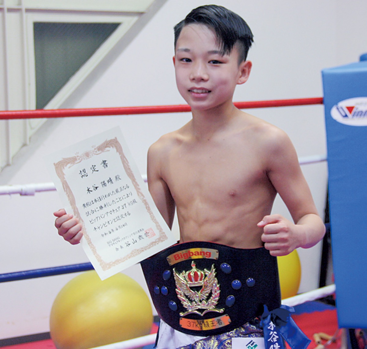 谷山ジム小田原道場所属の木谷陽晴(ひばる)さん(二宮中学2年)が4月24日に伊勢原市で開催されたキックボクシングの「第58回Bigbangアマチュア大会」37kg級のタイトルマッチに挑み、チャンピオンの栄冠を手にした。木谷さんは昨年、同大会の34kg級でも王者となっている。