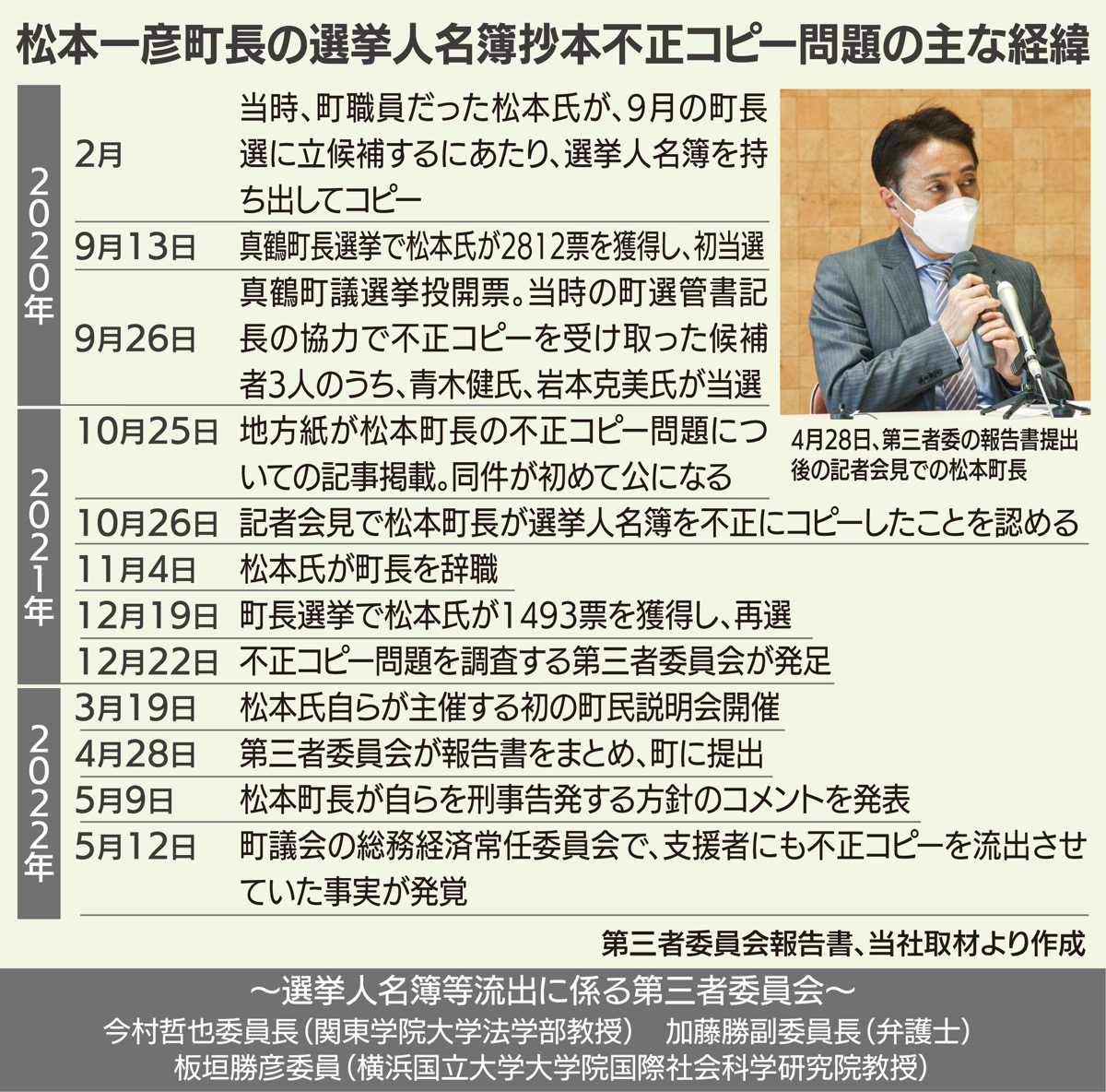 真鶴町の松本一彦町長が選挙人名簿抄本を不正にコピーし、流出させた問題を巡り、町政の混乱が続いている。調査にあたった町第三者委員会が4月末に提出した報告書を受け、町は松本町長らを刑事告発する方針を発表した。同報告書の内容をまとめる。