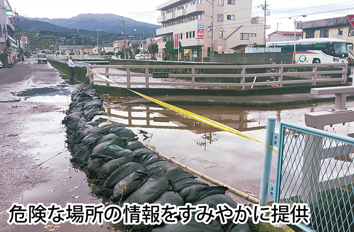 河川や海、そして土砂災害警戒区域に設置したセンサーなどから得た情報や、市民の皆さんからの通報を解析し、災害発生の危険性がどの程度高まっているのかを早期に把握・集約して情報発信します。