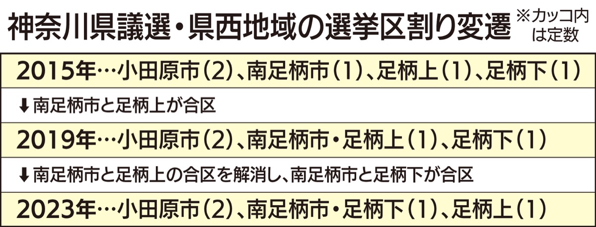 南足柄市は19年の選挙で「足柄上」と合区されており、今回の見直しにより2回連続して選挙区再編の対象になった。新しい区割りは次回選挙から適用される。