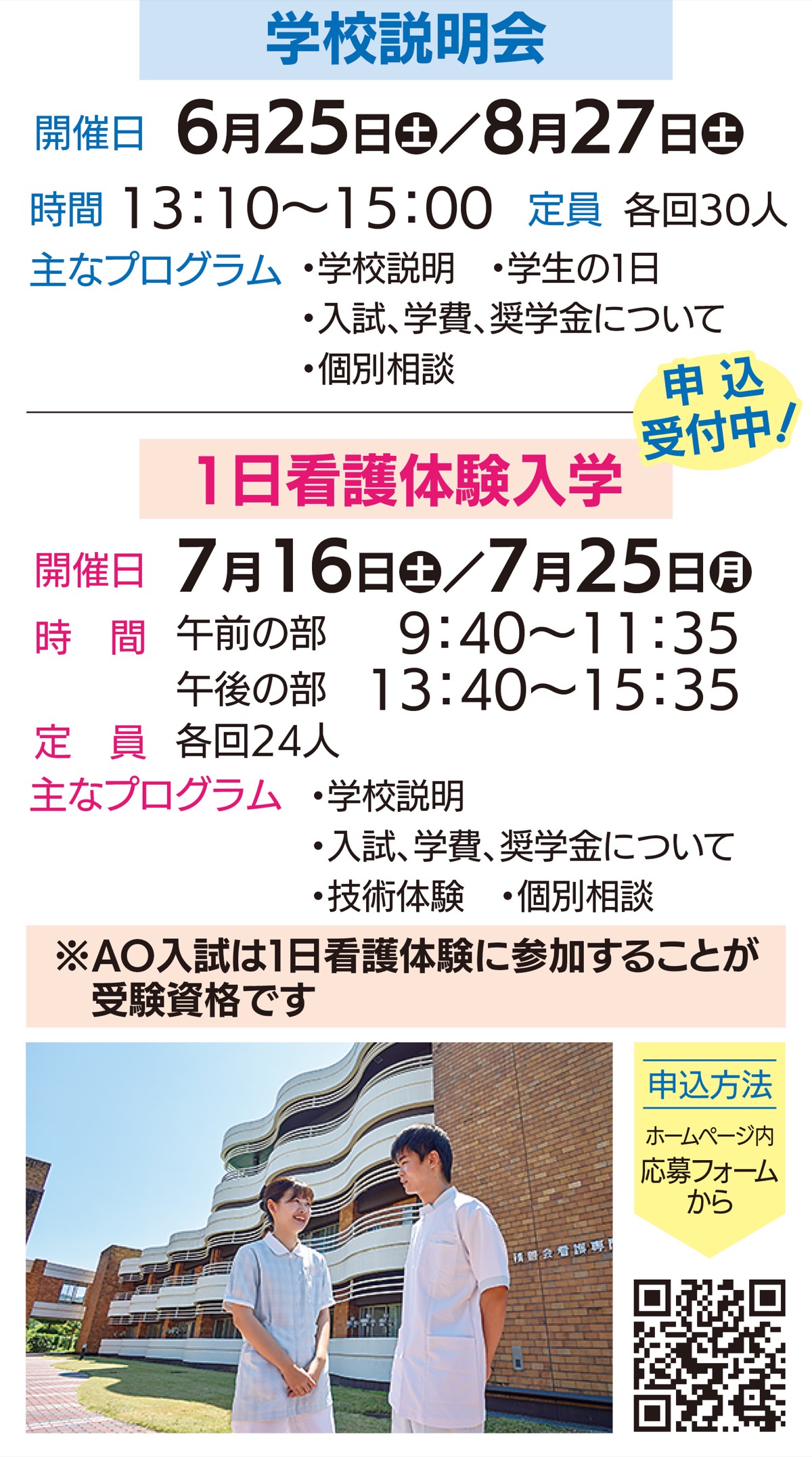 積善会看護専門学校(小田原市曽我岸148/曽我病院内)では、6月から8月に「学校説明会」「1日看護体験入学」を開催する。