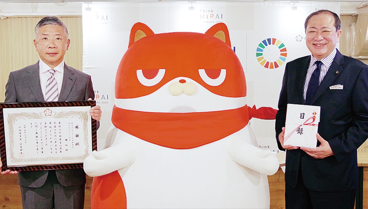 昨年4月にマルハン小田原店(市内国府津)をオープンした(株)マルハン東日本カンパニーがこのほど、小田原市に2千万円を寄附した。6月6日におだわらイノベーションラボ(ミナカ小田原)で受領式が行われた。