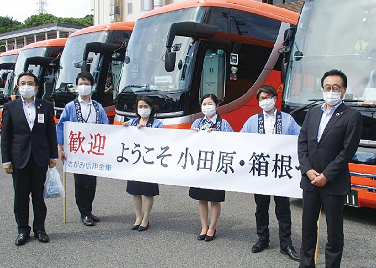 観光需要が全国的に戻りつつある中、創立100周年を記念した顧客向け箱根バス旅行に訪れた松本信用金庫一行をさがみ信用金庫(遠藤康弘理事長)が出迎えた。