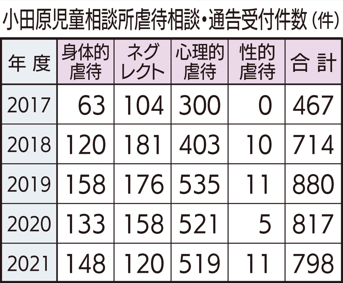 小田原児童相談所によると21年度の虐待相談・通告受付件数で最も多かったのが、暴言や子どもの前で夫婦喧嘩をするなどの「心理的虐待」で519件。次いで身体的虐待148件、ネグレクト120件、性的虐待11件だった。全体の約3割にあたる256件が警察からの通告。年齢別では小学生が300件と最も多く、幼児が286件、中学生が117件、乳児が51件、高校生が44件。