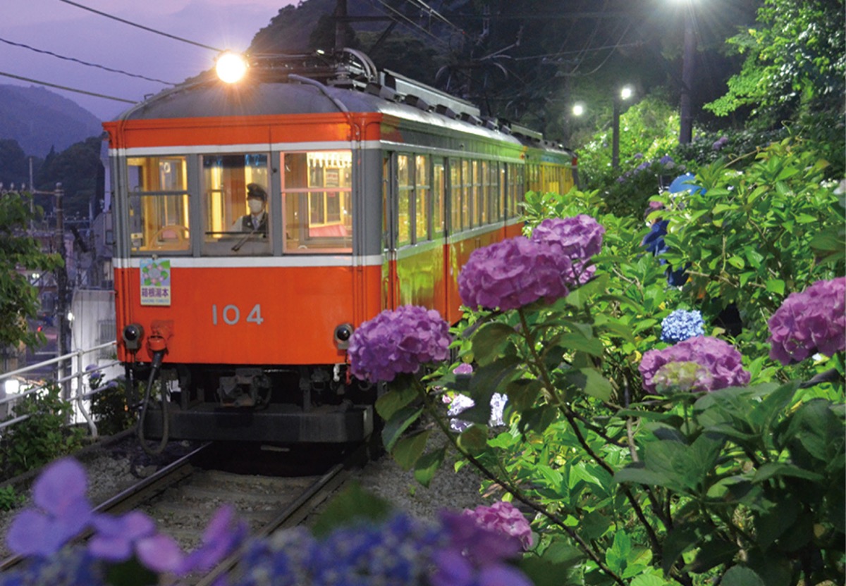 「あじさい電車」の愛称で親しまれている箱根登山鉄道。今年も沿線に咲くアジサイの夜間ライトアップを、7月3日(日)まで実施している。