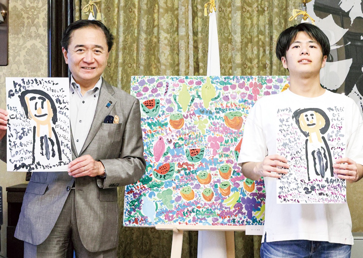 湯河原町在住の野々村聡眞さん(20)と、野々村さんがアート活動を行う障害者福祉サービス施設アール・ド・ヴィーヴル(小田原市久野)の職員が6月28日、県庁の知事室にリース作品の交換に訪れた。