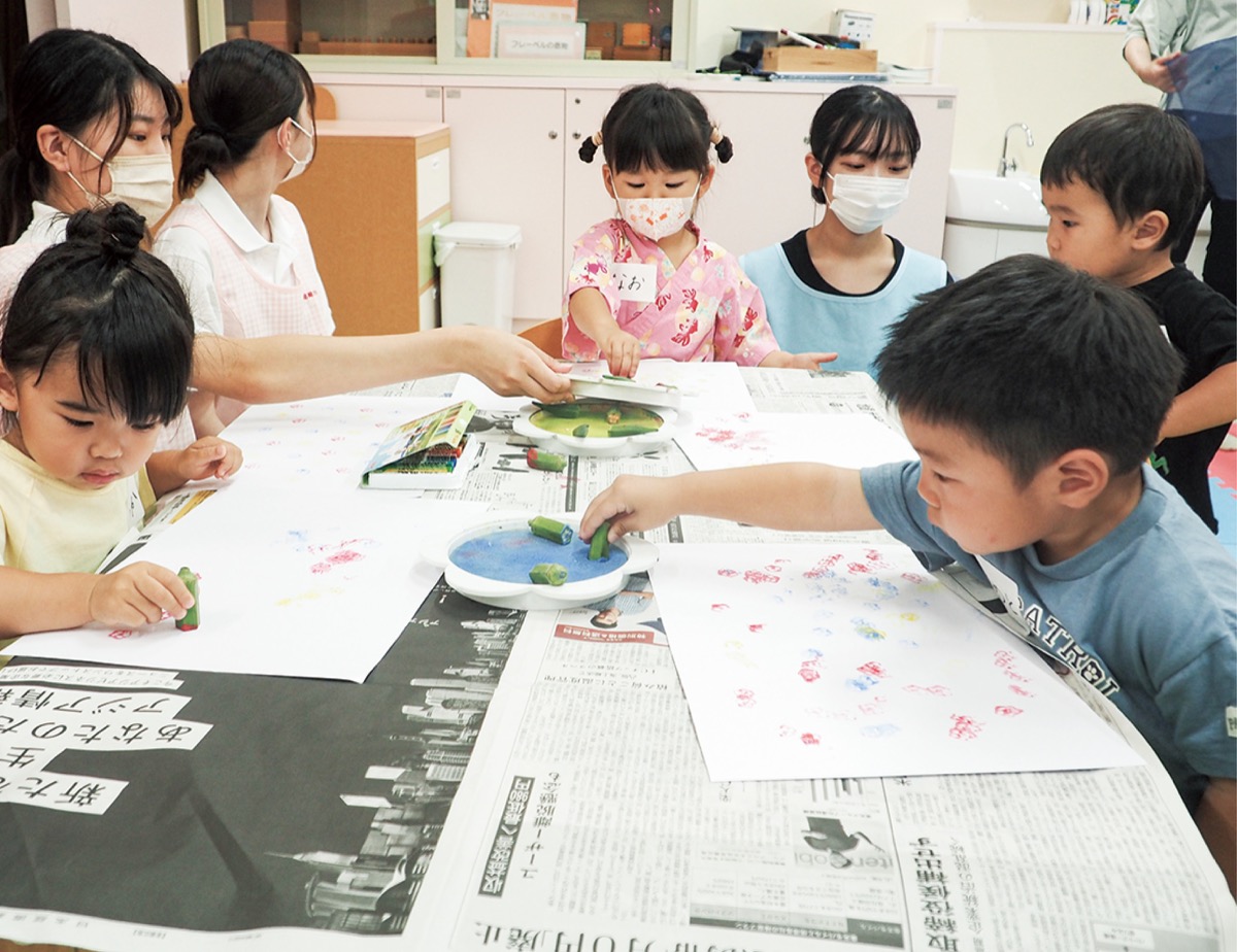 教室に響く、子どもたちの元気な声。天井には星空が投影され、机には手作りの野菜スタンプが並び、ピアノが楽し気に音を弾ませる。小田原短期大学の保育演習室で7月13日に開かれた2歳児を対象とした「おだたんくらぶ 幼児教室」の一場面だ。同大学が運営する「乳幼児研究室所」(宮川萬寿美所長・野津直樹副所長)が企画している。