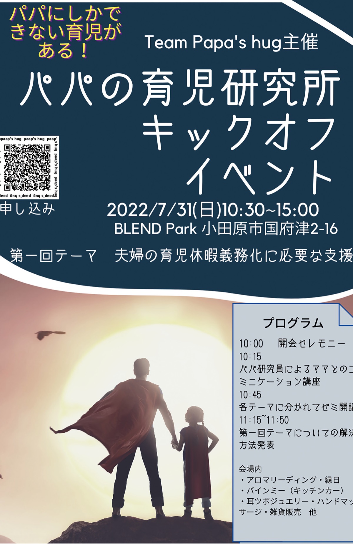 パパの育児研究所のキックオフイベントが7月31日(日)、ブレンドパーク(小田原市国府津2の6の17)で開催される。午前10時30分〜午後3時。主催はチームパパズハグ。