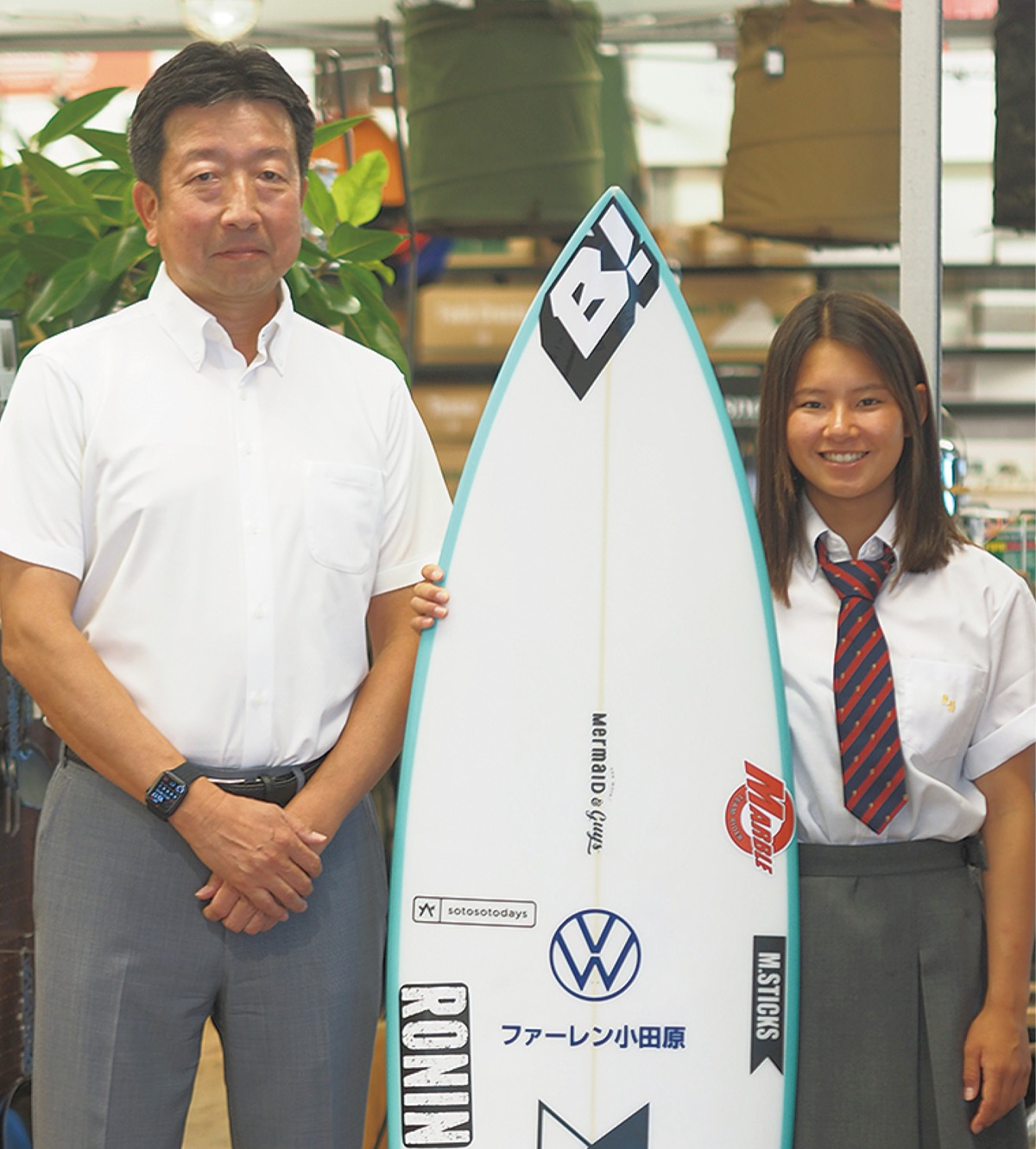 (株)丸江(江島賢代表取締役)が高校生プロサーファーの庄司莉花さん(相洋高校2年・湯河原町在住)と7月22日、スポンサー契約を結んだ。