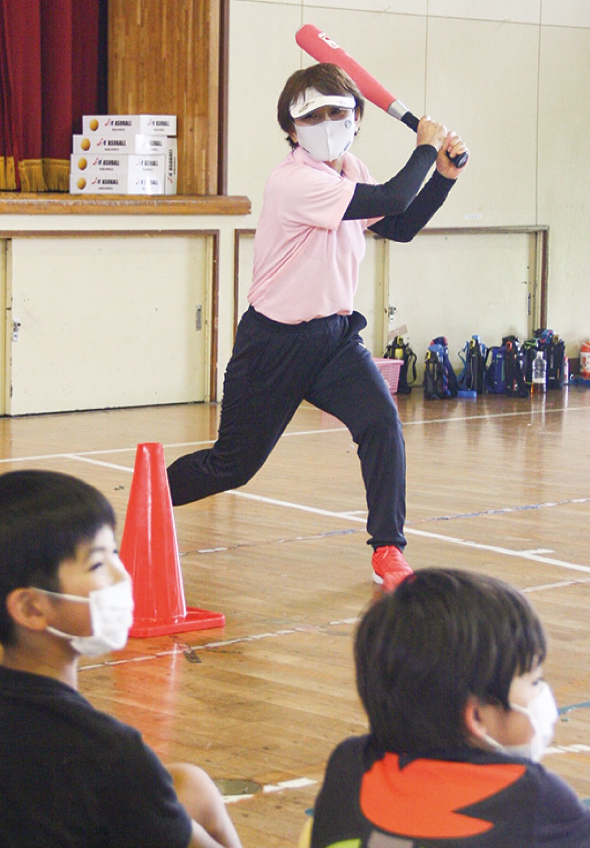 参加した4年生の女子児童は「すごく楽しかった。バットは空振りだったけど」と笑顔。宇津木さんは「失敗しても、失敗の中から学んでほしい。相手を思いやる気持ちも育てられれば」と語っていた。