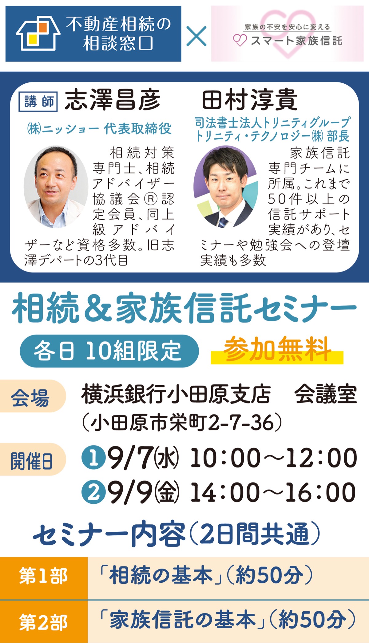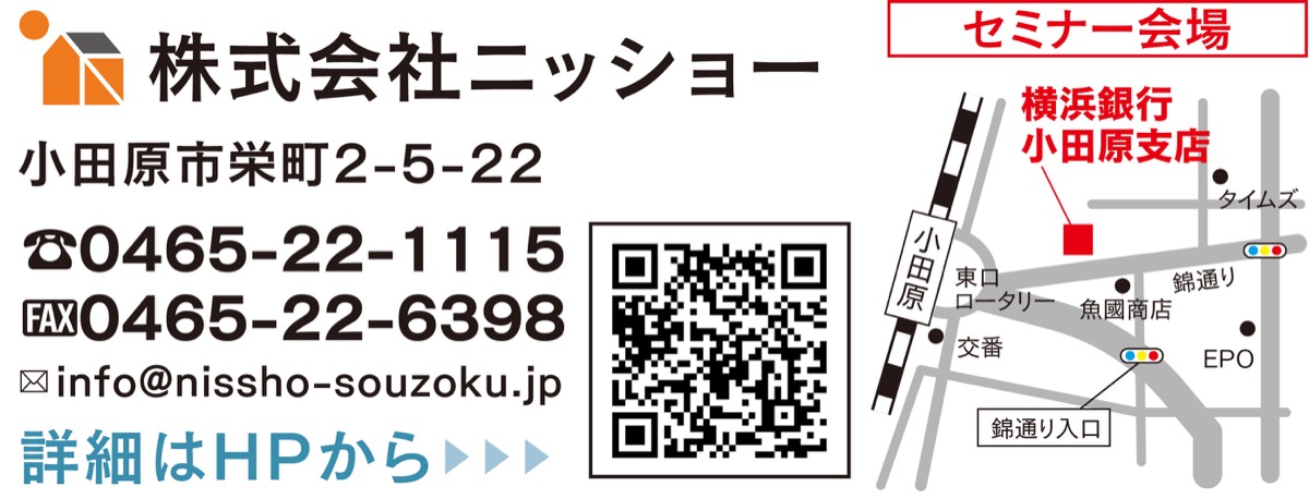 この「家族信託」と「相続」の基本が分かるセミナーが、9月7日(水)・9日(金)、横浜銀行小田原支店で開催される。講師は田村淳貴さん(司法書士法人トリニティ)と志澤昌彦さん((株)ニッショー)。